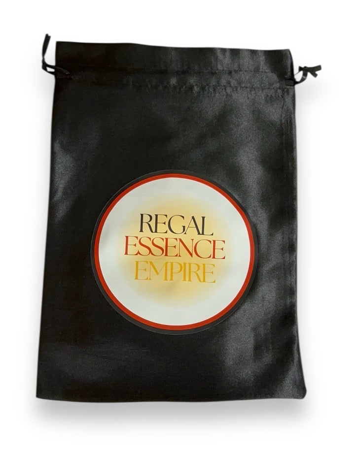“Our Regal Essence Empire Satin Logo Bag is designed to protect your wigs with luxury and care. Crafted from smooth, high-quality satin, this silk-feel storage bag helps maintain your wig’s softness, prevent tangles, and shield it from dust while keeping it beautifully preserved. Finished with our signature logo, it’s the perfect blend of elegance and protection for every wig.”